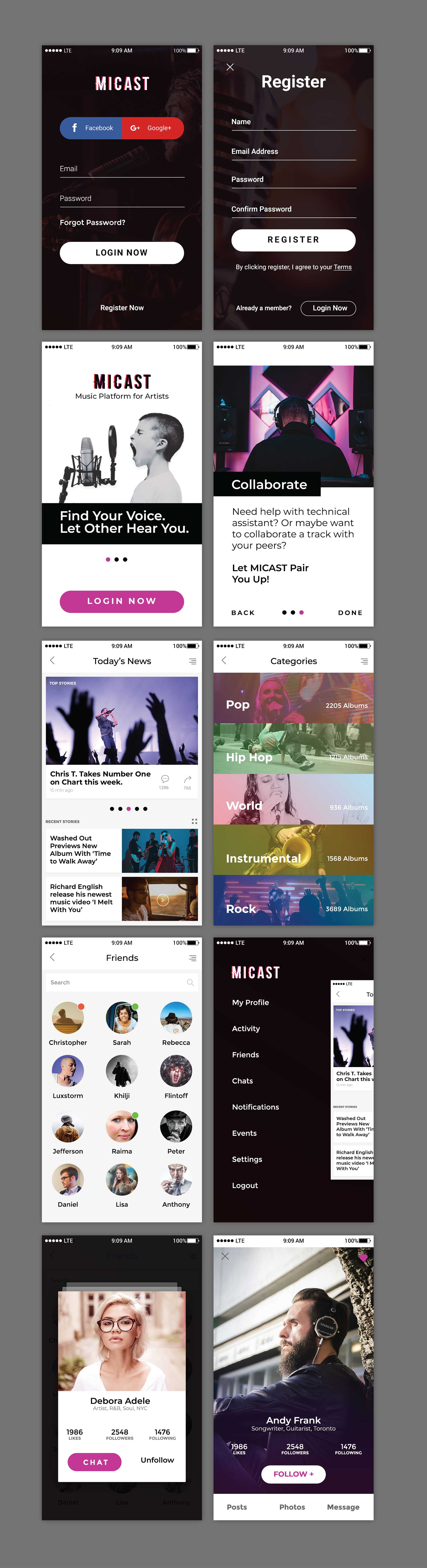 Micast was a new challenge I had taken on as my first official endeavor on mobile app interface design, and this experience has granted me the drive to continue enhancing my design skills in UI/UX designs for mobile applications.